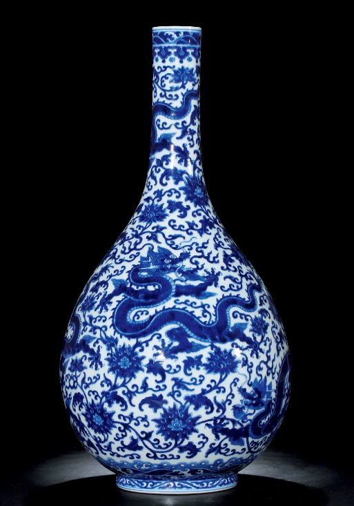 在 2018 年香港蘇富比春拍的「中國瓷器及藝術品」專場中,一件清乾隆 青花穿花龍紋長頸膽瓶(與文中長頸瓶同屬「穿花龍紋 + 長頸瓶」頂級品類),最終以1.04 億港元成交,震驚全球收藏界!