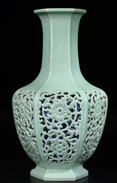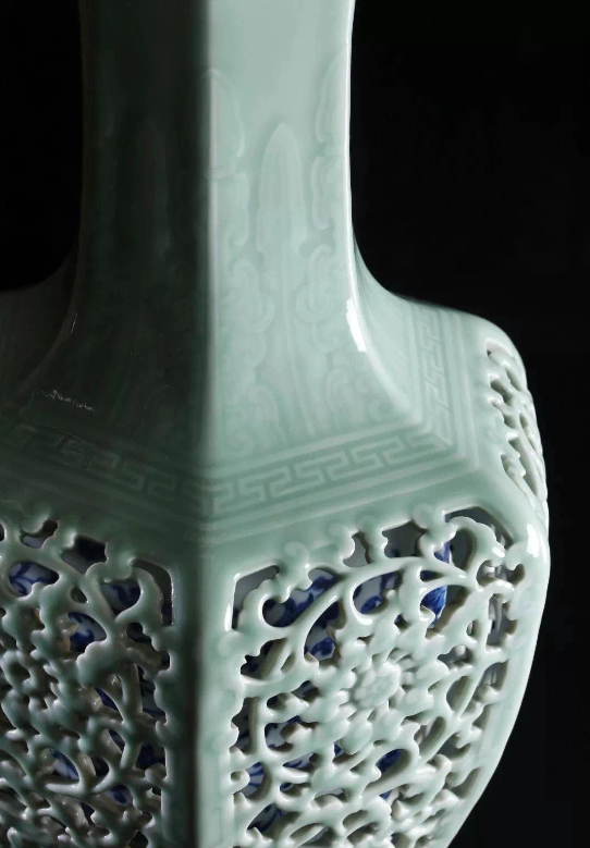 在 2010 年香港蘇富比秋拍的「重要中國瓷器及工藝品」專場,一件清乾隆 粉青釉鏤空纏枝花卉紋六方套瓶,最終以4892 萬港元成交,直接引爆收藏圈!