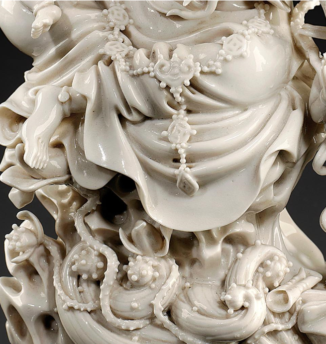 要读懂送子观音像,首先要解锁德化窑的 “王牌”——“中国白” 瓷。德化窑位于福建泉州德化县,自宋代便以烧造白瓷闻名,到了明代,其白瓷工艺达到顶峰,烧制出的瓷器胎质致密,釉色莹润,白中泛着淡淡的象牙黄,宛如凝脂白玉,被欧洲人誉为 “Blanc de Chine”(中国白),甚至一度成为欧洲贵族追捧的 “东方珍宝”。