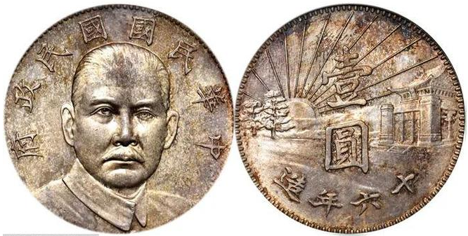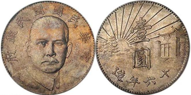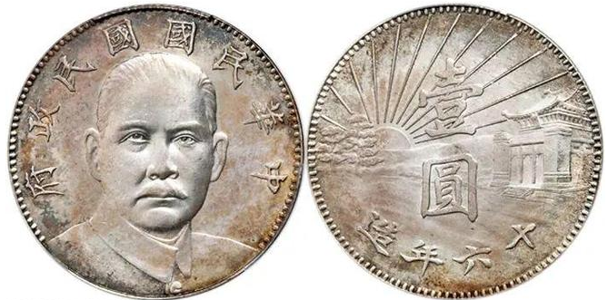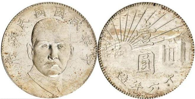 民國 16 年孫中山像陵墓壹圓雖未被採納,但是具有很高的藝術性和歷史紀念意義,該幣直徑 38.9mm,重 26.8g,正面為孫中山正像,著中山裝。上緣鐫刻「中華民國國民政府」,背面中間鐫刻「壹圓」,豎讀,下緣有「十六年造」字樣。