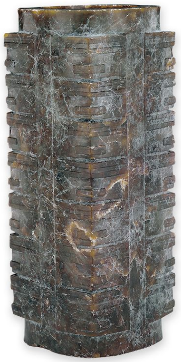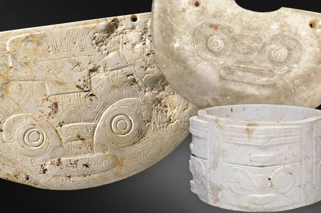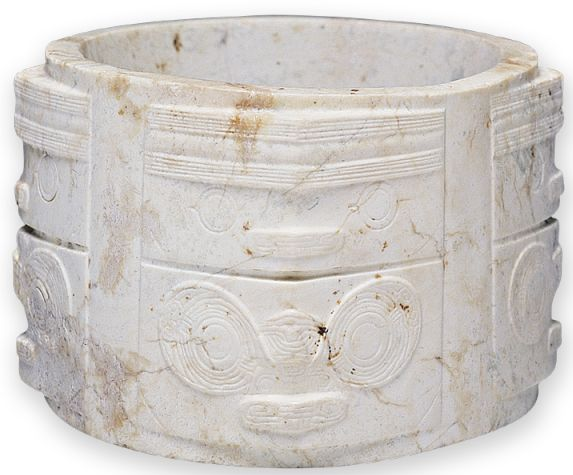 2019 年 11 月 27 日,佳士得香港「雲中玉筵」拍賣活動中,一件良渚文化三層人神獸面紋玉琮以 3132.5 萬港元高價成交。此琮為金華堂舊藏,1997 年購於香港,高 7.8 厘米,雞骨白色,器表土漬色未經清理,玉質緻密,有少量青色晶斑和褐色小斑點,局部透光。外形弧邊方形,中間大圓孔採用雙面管鑽,孔大壁薄,內壁打磨精細。以四角為中軸線分為三節,第一節戴冠神人面紋與第三節一致,第二節為獸面紋,一、二節複合成簡化「良渚神徽」。