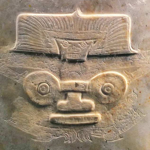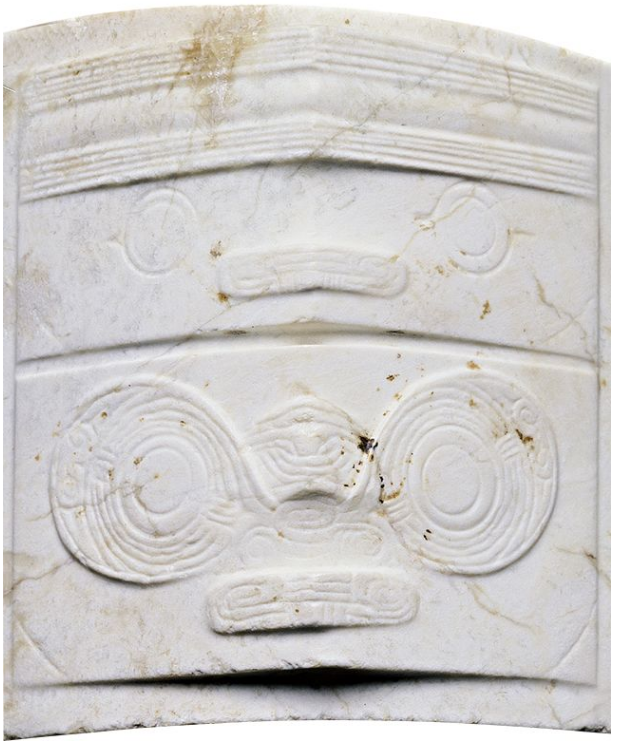 將此折角與直槽紋飾比較發現,小眼面紋應為神人紋簡化,而大眼面紋則是神人所馭神獸。這種以轉角為中軸對稱展開的神人紋及獸面紋,雖神人与獸面分開雕琢,省略神人肢體,但基本格局未變,整體表現仍具有共同特徵:神人紋以長平行線象徵羽冠、圓圈紋代表眼睛、凸橫棱顯示口鼻。
