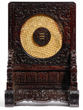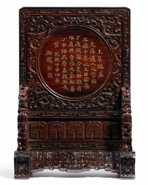 历届成交记录:2019 年 4 月 3 日清乾隆 紫檀雕夔紋嵌漢玉璧御製詩插屏 《乾隆甲申仲春御題》、《乾隆甲申春日御題》款在蘇富比拍賣,估價 7,000,000 — 9,000,000,成交價 13,375,000 港幣。總高 22.2 公分,8 3/4 英寸;壁 10.3 公分,4 英寸。