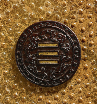 历史来历:该插屏制作于乾隆二十九年(1764 年)春,其制作有明确的《清宫内务府造办处档案》记载。乾隆二十八年三月十九日,太监如意交汉玉乳丁璧一件,传旨著做插屏一件,先呈样。之后经过画样、呈览等流程,于五月十四日,郎中白世秀将汉玉乳丁元璧一件配得紫檀木插屏一件持进交太监如意呈进讫。插屏方形紫檀木作框,前方中开圆形置玉璧,以雕乾挂和螭龙纹的圆钮固定,框边雕螭龙及蚕纹。