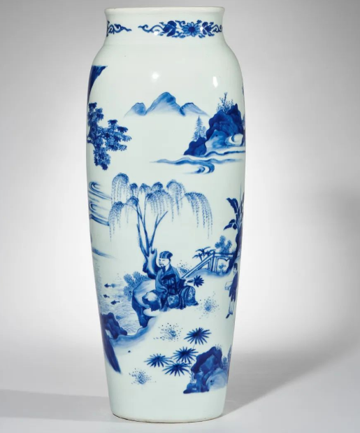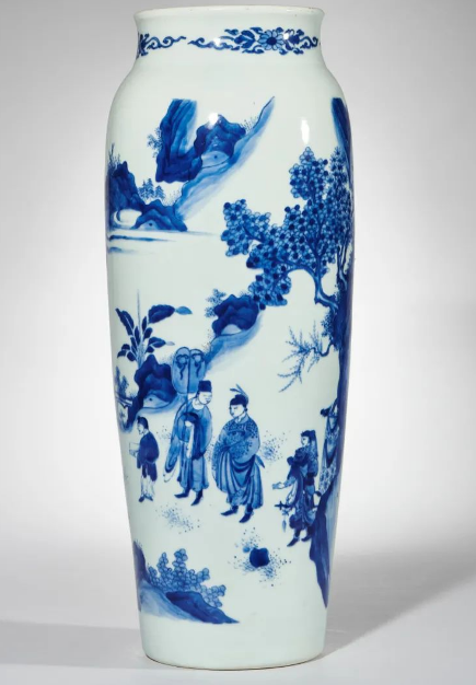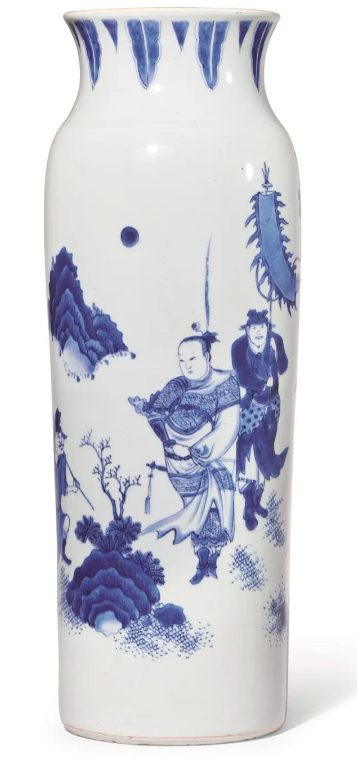 成交记录:中国嘉德拍卖,成交价 920,000 元人民币。此筒瓶胎体细腻洁白,釉面润泽,口颈处青花施亚字纹和轮花纹,腹部主体绘三国演义之凤仪亭故事,