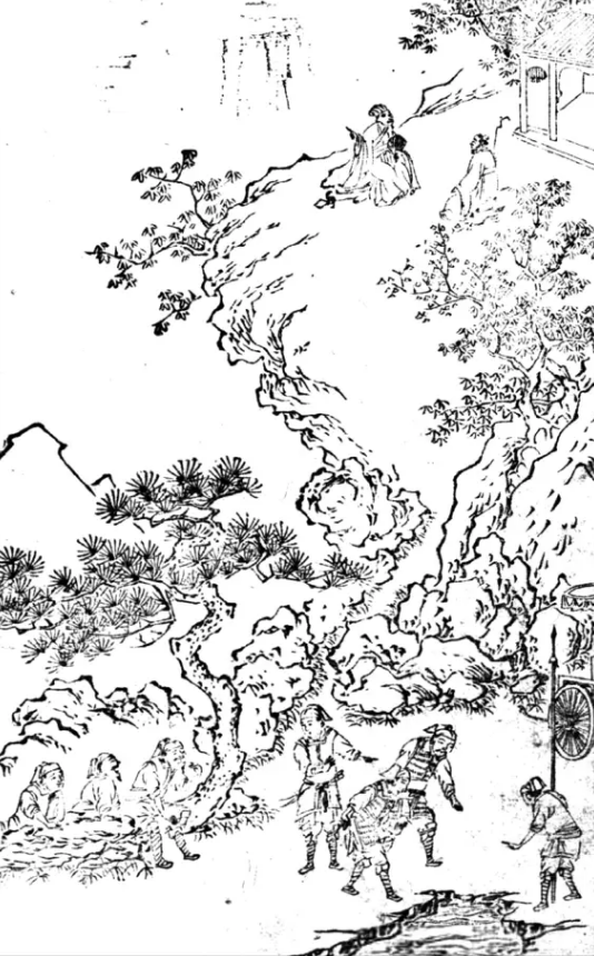 画面一侧绘孔明倚石而坐,于池边悠闲观鱼,营造氛围看似闲适,却于人物眉目之间可见思虑之状。另侧诸人站立,其中衣着装饰最为精致者为后主刘禅,刘禅身旁侍从手执仗义扇,小心服侍。所绘图景与明末《遗香堂绘像三国志》“安居平五路”一幕画意相仿,皆为表现后主刘禅上门求救诸葛亮之情节。