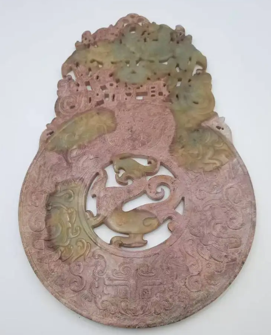 • 器物特征:高 25 厘米(含出廓部分),白玉质受土沁呈鸡骨白色,璧面以乳丁纹为地,边缘雕刻饕餮纹变体纹饰,上部出廓区域为双螭虎戏珠造型,虽未直接雕刻 “宜子孙” 铭文,但从工艺组合(饕餮 + 螭虎)与尺寸规格判断,应为汉代贵族祈福用玉,与 “宜子孙” 题材的功能属性高度契合。