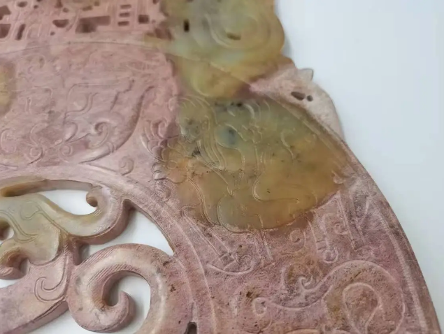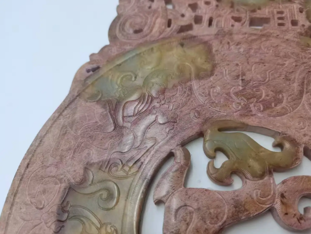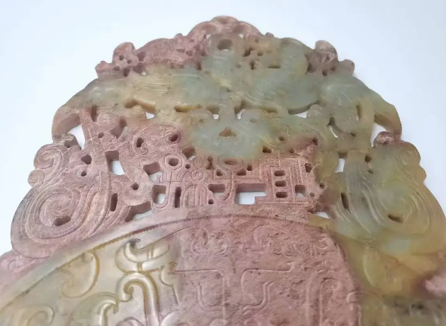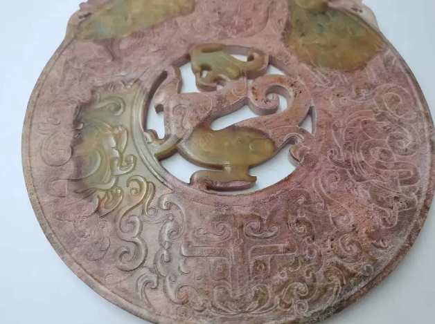 • 器物特征:直径 18.5 厘米,青白玉质带自然沁色,主体为谷纹璧,上部出廓区域雕刻螭虎纹,璧面隐现篆书铭文(因沁色模糊,部分字迹推测与 “宜子孙” 吉祥寓意相关)。采用汉代典型的 “透雕 + 阴刻” 复合工艺,螭虎造型矫健,线条流畅,符合东汉早期螭虎纹 “头大颈细、四肢劲健” 的特征。