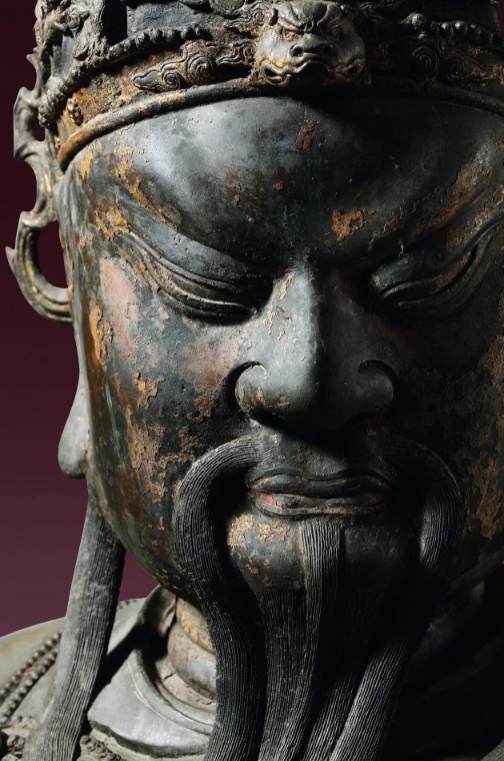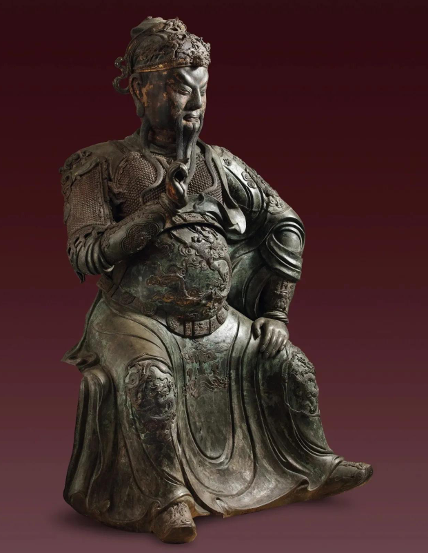 此尊明早期御制漆金彩绘铜关帝坐像,关帝头戴龙冠,金面丰颐,丹凤眼,卧蚕眉,五绺美髯,俊朗不凡;呈武士端坐,铠甲外披龙袍,一手轻捻胡须,一手置于腿上,纹饰刻画精准,躯体结构完美,塑像线条流畅而华美,给人以气势如虹、威震天下之感,确有明代早期国运昌隆国力强盛之相,为现存已知关帝形象中体量最大、艺术性最佳之雕塑作品,加之品相完好,且来源清晰、流传有序,实为当之无愧的旷世杰作。