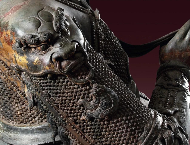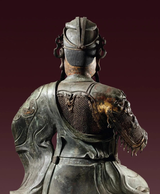 尊像造型深具美感,技巧精湛,刚柔并济,流畅柔软的袈裟和层层凸起的鳞甲,呈现出不同物料的质感;且躯干造型无一处重复,其右肩兽头怒张大口,手肘铠甲线条硬朗笔直,左肩袈裟光滑简洁,手肘下垂衣纹畅顺。右膝铠甲露出,左膝袈裟垂落,虽为坐姿,却仍气宇轩昂,难挡英武之相,显现出关羽智慧与勇武并存,是忠义两全的化身。