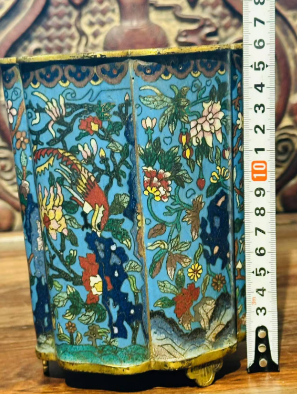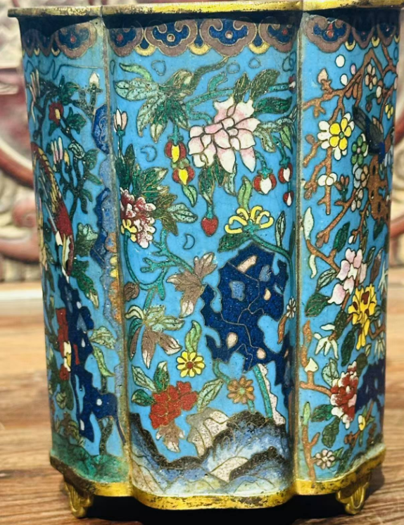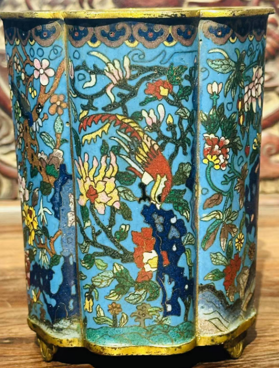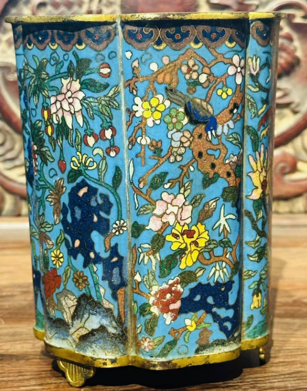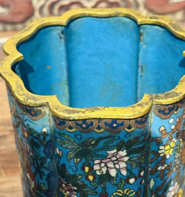 铜胎景泰蓝掐丝珐琅葵口笔筒,正是这一时期的典型代表。它并非普通文房用具,而是兼具 “实用” 与 “陈设” 功能的宫廷珍品 —— 清代文人阶层崛起,帝王亦好 “文房雅玩”,雍正帝曾在《养心殿造办处活计档》中多次下旨 “仿古制珐琅笔筒,务求精巧”,可见其在宫廷文房体系中的重要地位。这类笔筒多为皇室赏赐重臣或自用,民间难得一见,存世量极少,如今完整品相的清代葵口珐琅笔筒,全国博物馆馆藏不足 20 件。
