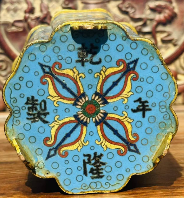 - 器物细节:高 14.5 厘米,口径 12 厘米,葵口呈六瓣形,胎体轻薄却手感厚重(重 850 克);器身满饰缠枝莲纹,釉色以宝蓝为主,间杂翠绿、明黄,色彩过渡自然;口沿与底足鎏金完好,仅局部有轻微磨损;底足钤 “乾隆年制” 四字篆书款,字体规整,符合乾隆朝造办处署款规范。