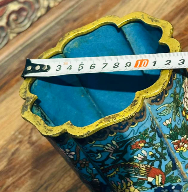 - 铜胎:坚质为基:选用云南精炼黄铜,经 “九炼九锻” 制成薄而坚韧的葵口形胎体 —— 葵口设计并非随意为之,而是模仿宋代瓷器的经典造型,花瓣式口沿既美观又能防止笔筒滚动,体现 “实用与美学” 的结合。工匠需将铜片反复捶打、裁剪,使胎体厚度均匀至 0.3 毫米,误差不超过 0.05 毫米,确保后续掐丝与烧蓝的平整。