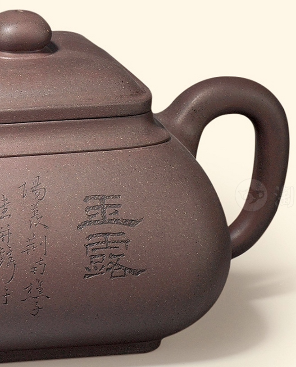 不同于普通紫砂茶具的素净,《玉露诗文五头茶具》最动人的,是壶身与杯壁上镌刻的 “玉露” 诗文。字体选用清雅的行楷,笔锋婉转有力,墨色与紫泥的底色相映成趣,仿佛将一幅水墨画卷凝刻在茶具之上。“玉露沾香蕊,清茗润雅心”,短短两句诗,既点出了 “玉露” 之名的雅致,又道出了品茶时的悠然心境,让茶具不再是单纯的饮茶器具,更成为承载文人情怀的艺术品。