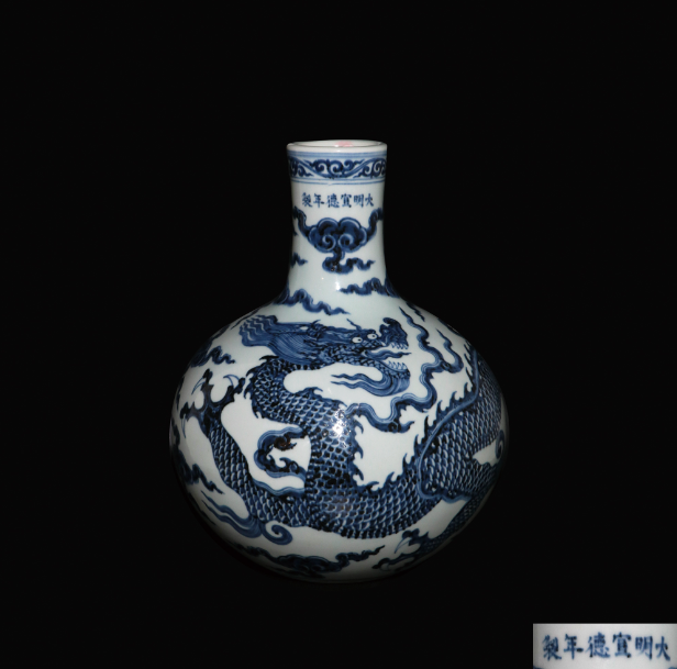 在拍賣市場上,宣德青花向來是頂級藏家競逐的焦點。2016 年香港蘇富比春拍,一件宣德青花三果紋執壺以 2.53 億港元成交;2021 年北京保利秋拍,宣德青花海水龍紋高足碗以 1.12 億元落槌。而完整品相的宣德天球瓶,因存世量極少(全球公立博物館收藏不足十件,民間流通者更是鳳毛麟角),其價值早已超越金銀。這件天球瓶不僅品相完好,更保留了清晰的「大明宣德年製」六字楷書款,款識筆力遒勁,結構嚴謹,是鑒定宣德官窯的重要依據。